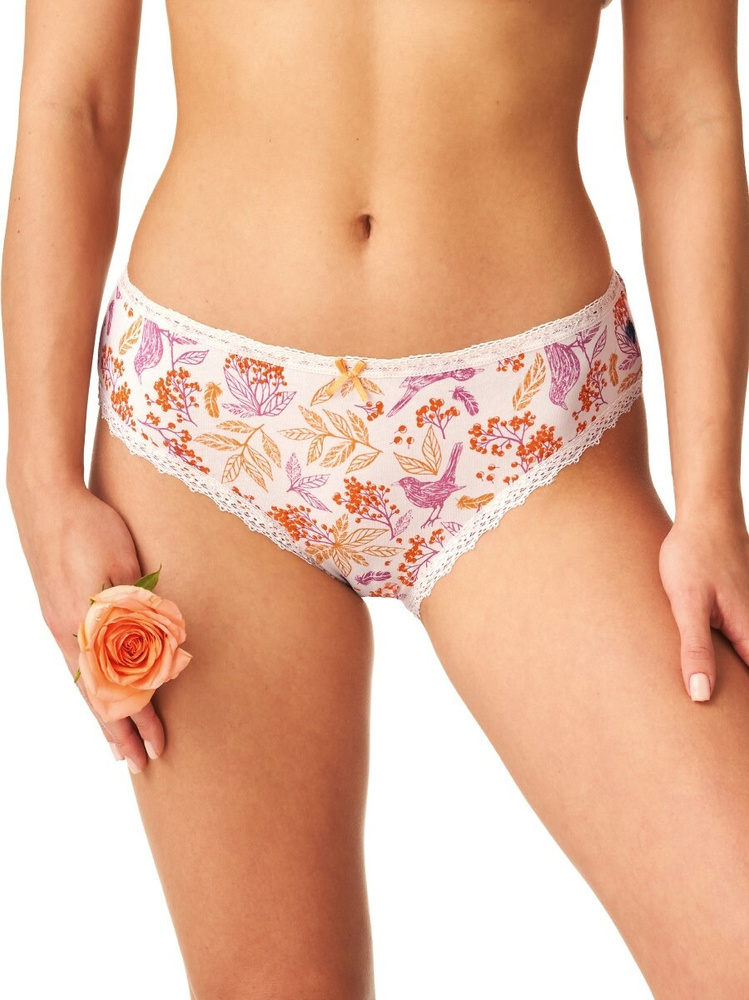 Figi damskie wykonane z wysokiej jakości gładkiej bawełny. Krój bikini o wyższej linii talii, zdobione delikatną koronką .