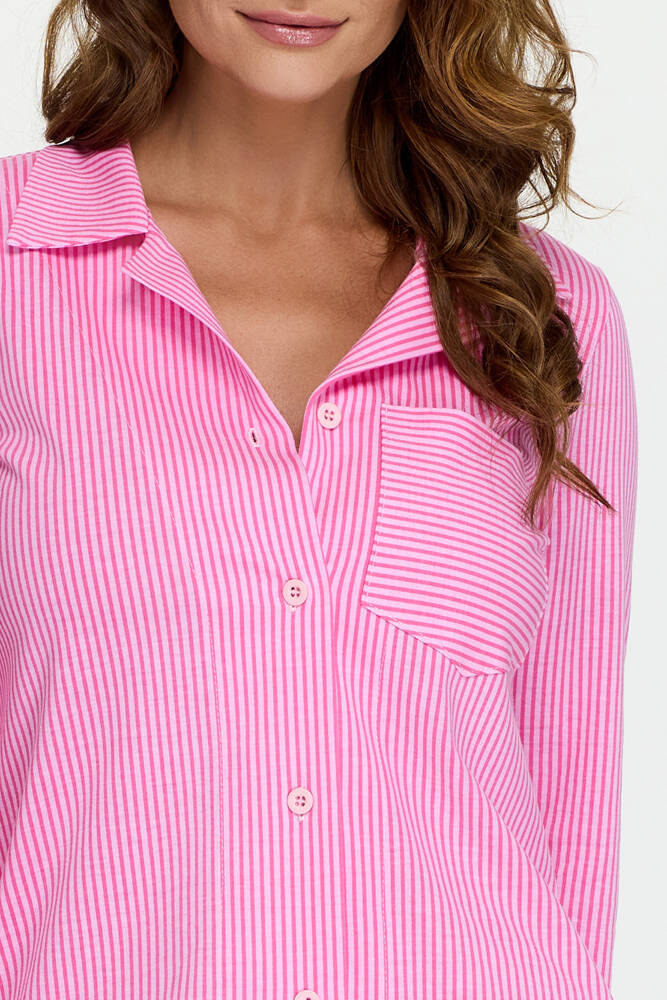 Koszula nocna w różowe paski. Posiada długi rękaw zakończony mankietem. Dekolt z kołnierzykiem. Na przodzie ozdobna kieszonka. Półokrągły dół. Długość przed kolano. Zapinana na guziki. Koszula wykonana z miękkiej bawełny, zapewniająca komfort noszenia.