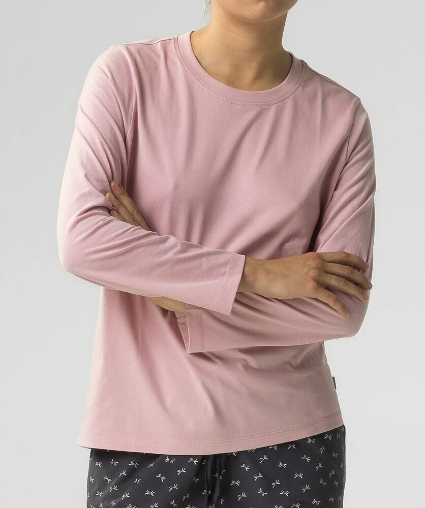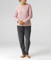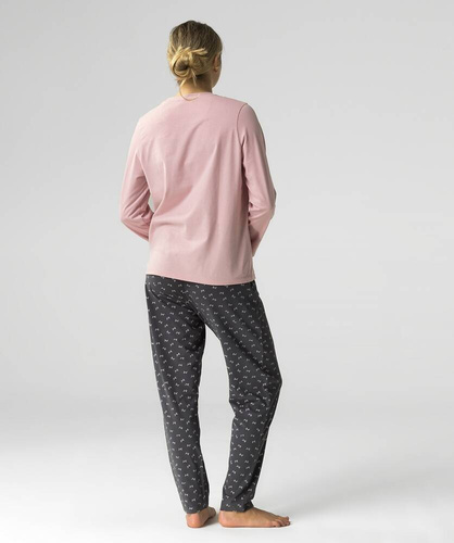 Dla pań, którym zawsze jest gorąco, ulgę i wygodę zapewni stylowa damska piżama z długimi spodniami i długim rękawem. Naturalny, oddychający materiał jest miękki, przyjemny i bezpieczny dla skóry, a prosty krój zapewni wygodę i swobodę ruchów. Zgrabna damska piżama - w bluzie okrągły dekolt , spodnie z funkcjonalnymi kieszonkami.