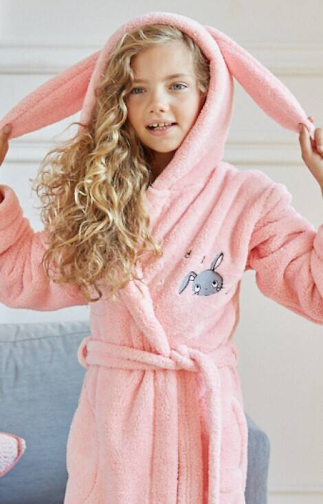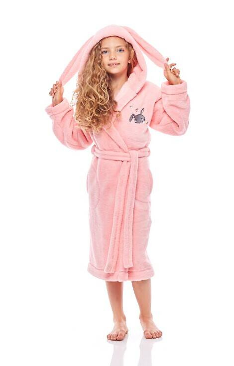 Szlafrok dziecięcy z kapturem, z mięciutkiej, bardzo miłej w dotyku dzianiny typu soft. Wiązany w pasie. Na wysokości bioder wygodne kieszenie. Na wysokości klatki piersiowej naszywka w kształcie królika.
