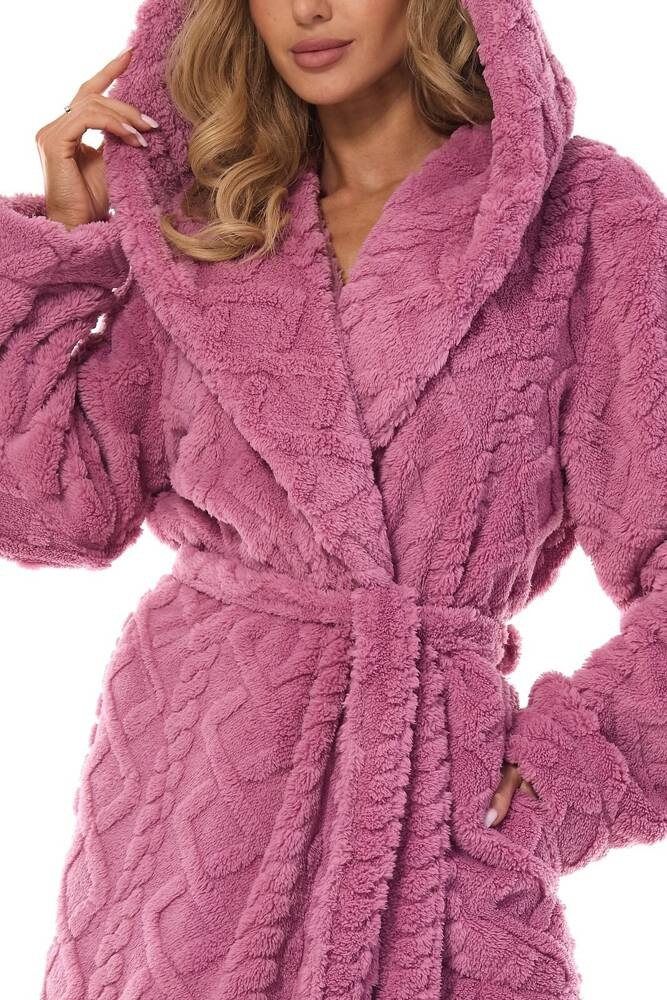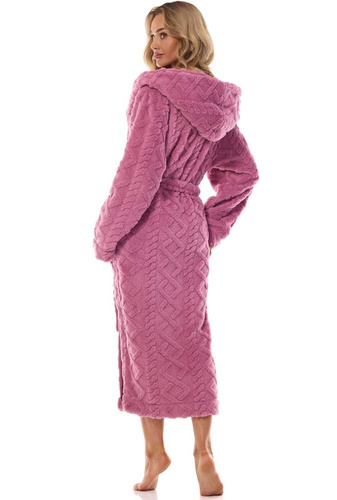 Szlafrok damski długi z kapturem z dzianiny typu super soft miękka dzianina z wytłaczanym, wypukłym wzorem. Wiązany w pasie, na wysokości bioder kieszenie.