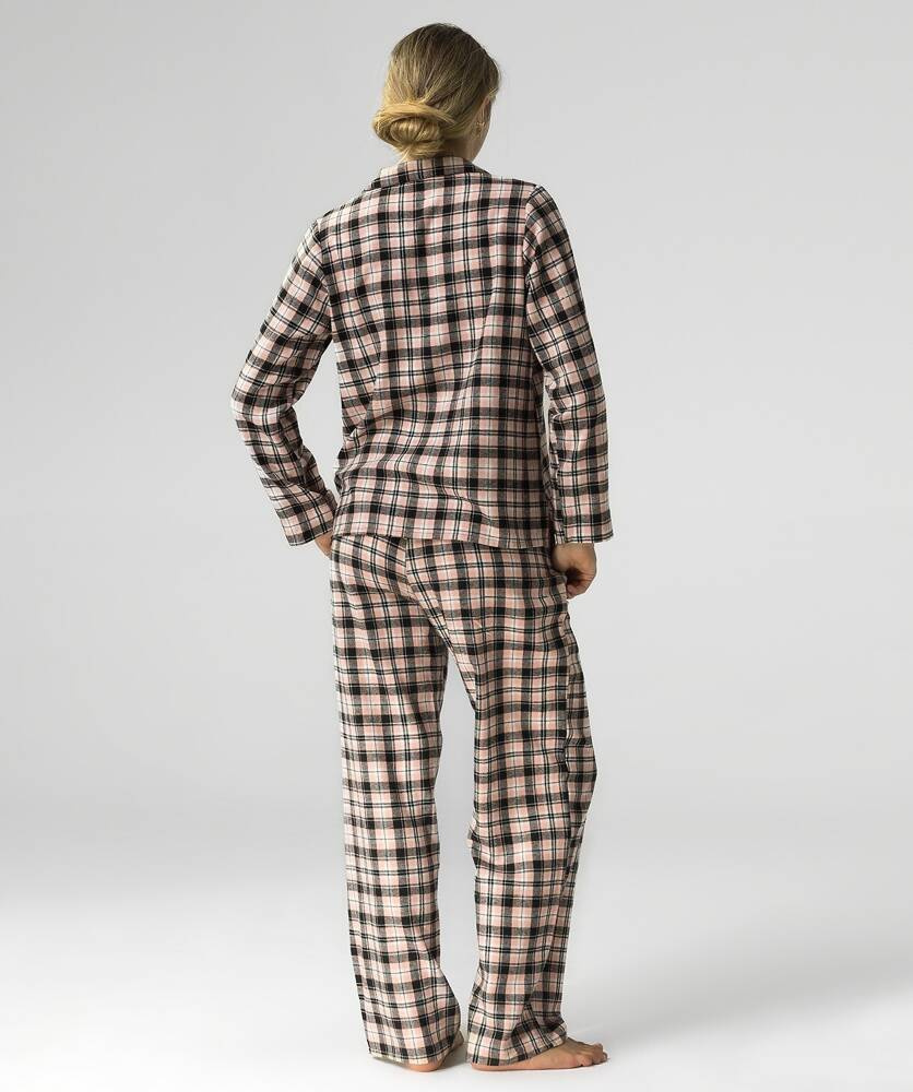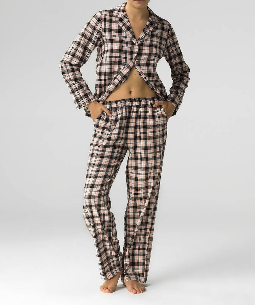 Ulgę i wygodę zapewni stylowa damska piżama z długimi spodniami i długim rękawem. Naturalny, oddychający materiał jest miękki, przyjemny i bezpieczny dla skóry, a prosty krój zapewni wygodę i swobodę ruchów. Zgrabna damska piżama z efektem "pech effect" - bluzka z kołnierzykiem rozpinana , spodnie z funkcjonalnymi kieszonkami.