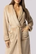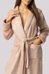 Damski szlafrok wykonany z przyjemnego materiału flannel fleece o subtelnym połysku. Wykończony elegancką, białą lamówką. Posiada dwie kieszenie oraz pasek umożliwiający regulację obwodu. Miękki, puszysty materiał delikatnie otula i ogrzewa ciało. Jest łatwy w pielęgnacji - szlafrok można prać w pralce. Ma prostą formę, długość do połowy łydki, długie rękawy oraz stylowy, wywijany kołnierz. Obwód szlafroka można regulować za pomocą dołączonego paska.
