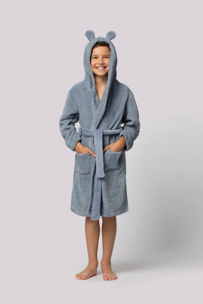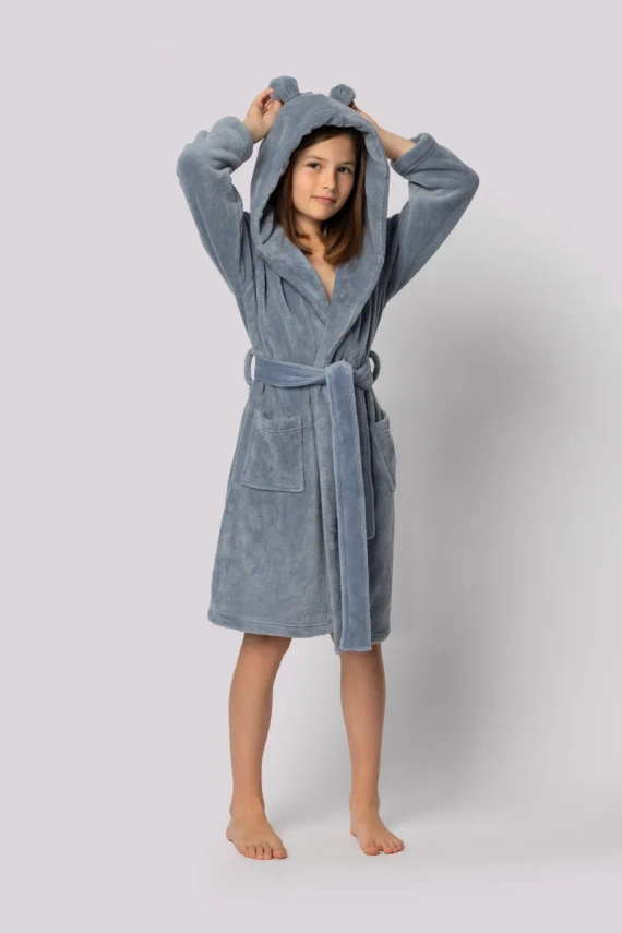 Szlafrok dziecięcy u szyty z miękkiego, puszystego materiału coral fleece, który przyjemnie otula i ogrzewa. Posiada komfortowy, obszerny kaptur ozdobiony uroczymi uszkami oraz dwie kieszenie. Wykonany jest z przyjemnego w dotyku, wysokogatunkowego materiału, który można prać w pralce. Szlafrok o długości do kolan i luźnym kroju zapewnia swobodę ruchów. Regulacja szerokości za pomocą paska, duży kaptur i dwie praktyczne kieszenie dodają wygody.