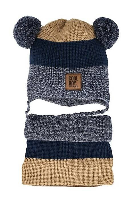 Dwuwarstwowy komplet chłopięcy z dwoma pomponami. Do kompletu golf. Idealny na chłodne dni
