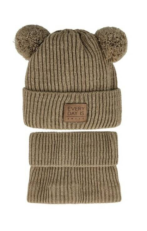 Czapka od wewnątrz podszyta bawełną. Z dwoma pomponami, z wywijanym otokiem. Do kompletu golf. Idealny na chłodne dni