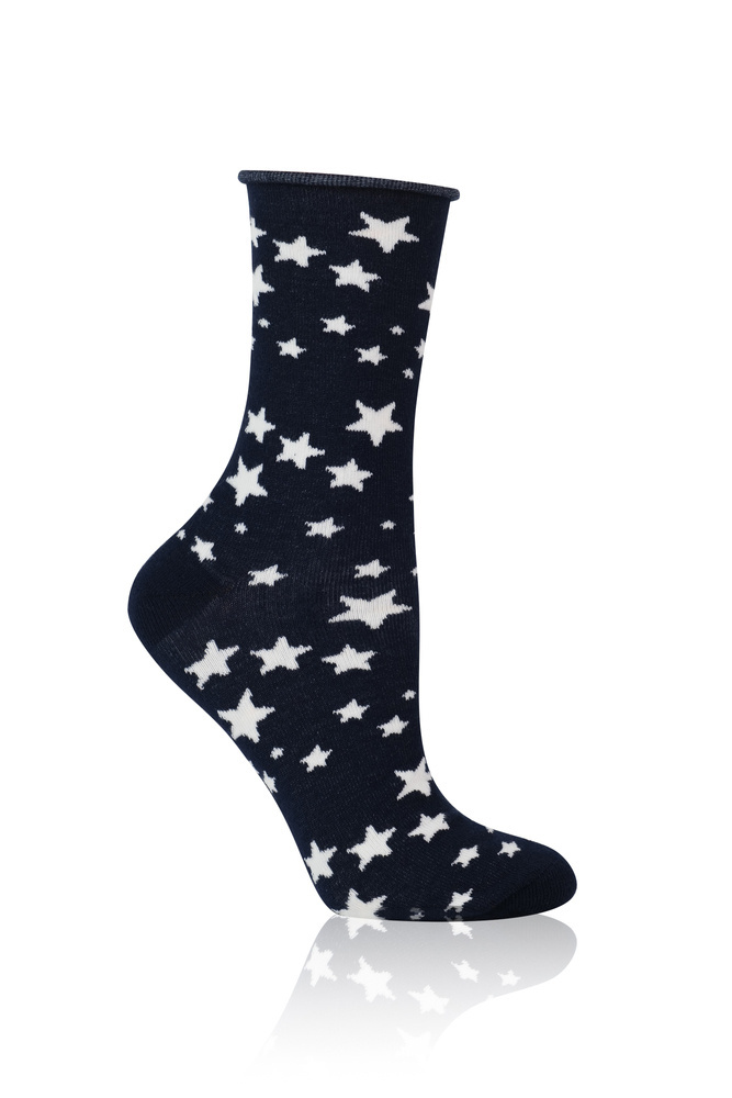 Bezuciskowe skarpetki wykończone rulonikiem od lat cieszą się nieustającą popularnością w kolejnych kolekcjach skarpetek Italian Fashion. W tym sezonie przybierają szaty rodziny koszul i piżam Arugia i Libra drukowanych w zawsze modny motyw gwiazdek.