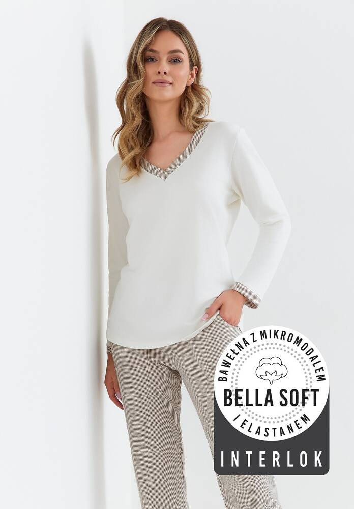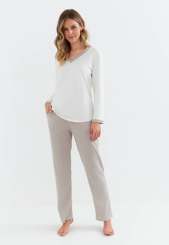 Do kompletu długie spodnie w delikatną kratkę z wygodnymi kieszeniami