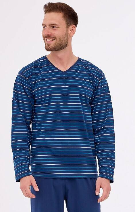 Piżama męska z wysokiej jakości bawełny. Bluza z długim rękawem w paski, dekolt w szpic. Do kompletu długie proste spodnie. Pakowana w pudełko.