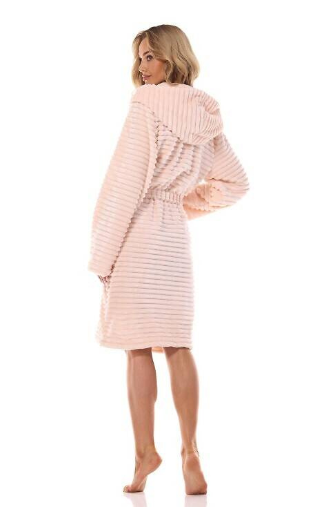 Szlafrok damski z kapturem z  miękkiej dzianiny. Faktura w wypukłe pasy.