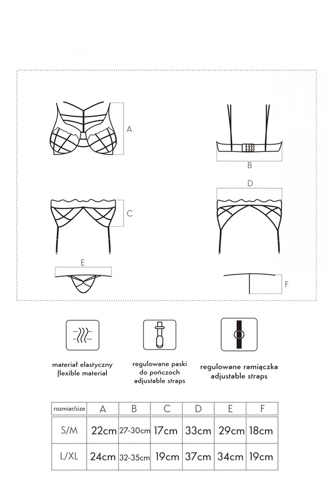 Komplet bielizny o eleganckim kroju. Biustonosz na cienkich, regulowanych ramiączkach. W komplecie stringi i pas do pończoch.