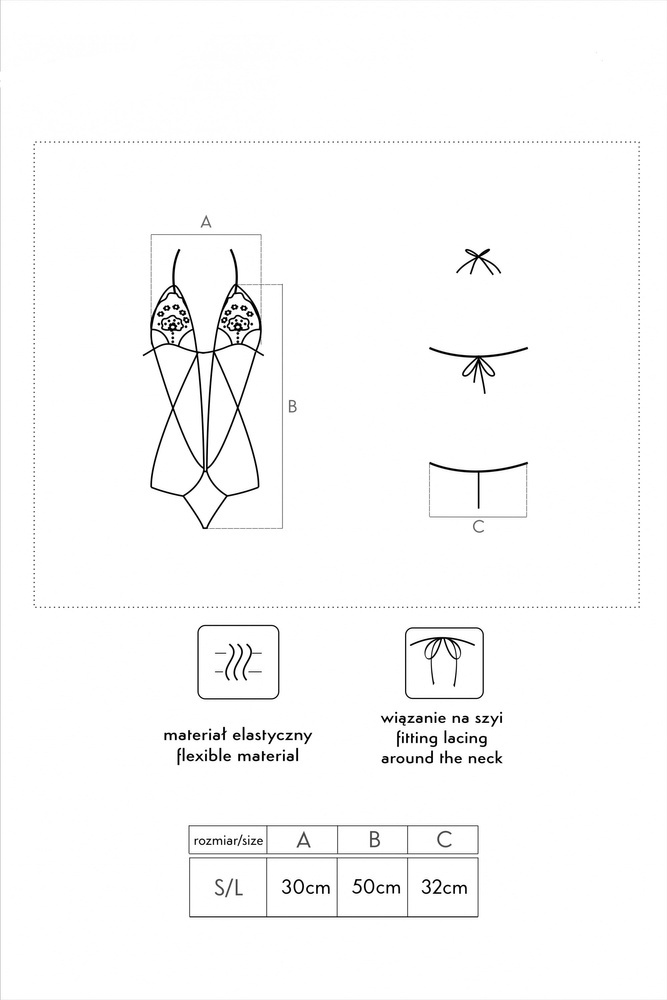 Body składa się z delikatnego koronkowego biustonosza i stringów z motywem różyczki. Stringi i staniczek połączone są plątaniną paseczków podkreślających wcięcie w talii i kobiece krągłości. Biustonosz częściowo odsłaniający piersi. Pomysłowo poprowadzone paski spływające w dół, między piersiami do stringów optycznie wysmuklają sylwetkę. Praktycznie odsłonięte biodra i ramiona, a także plecy i pupa które zdobią tylko paseczek stringów i dwa sznureczki wiązania , sprawiają, że jest to odważna propozycja dla niej.