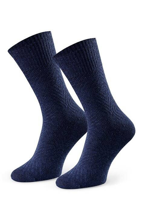 Wełniane skarpety męskie w geometrycznej strukturze. Posiadają nieuciskający ściągacz. Zapewniają uczucie ciepła.