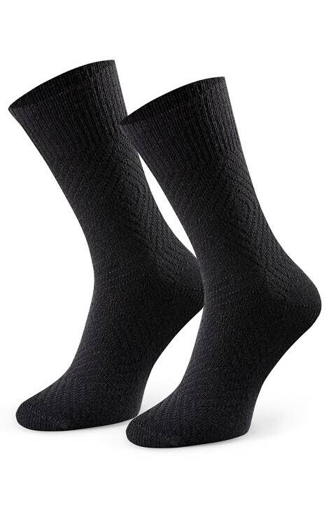 Wełniane skarpety męskie w geometrycznej strukturze. Posiadają nieuciskający ściągacz. Zapewniają uczucie ciepła.
