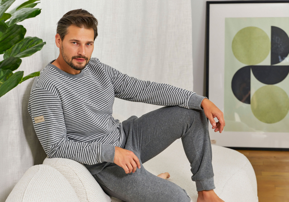 Klasyczna piżama męska z długim rękawem w pasy, uszyta z grubej bawełny intelook, dekolt okrągły. Do kompletu długie jednolite spodnie zakończone ściągaczem z kieszeniami