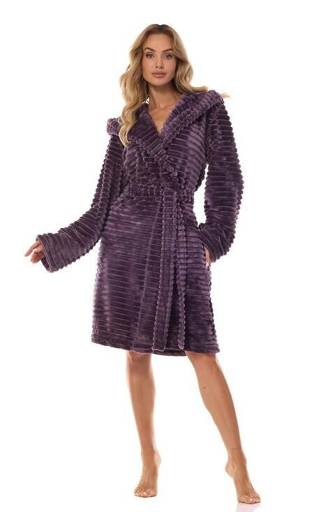 Szlafrok damski z kapturem z  miękkiej dzianiny. Faktura w wypukłe pasy.