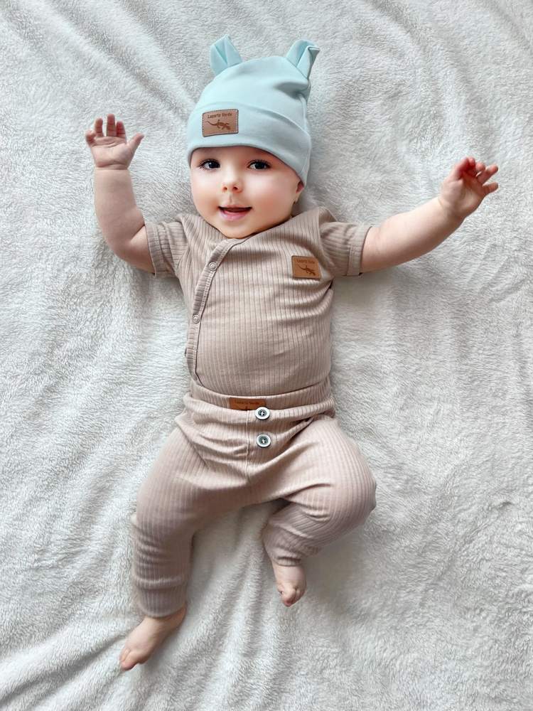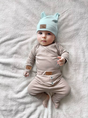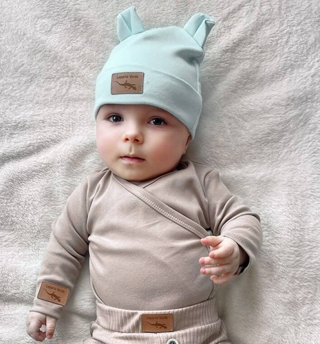 Czapka niemowlęca uszyta w Polsce z bardzo przyjemnej w dotyku bawełny. Wklejana metka zamiast wszywki – zapobiega podrażnieniom skóry.