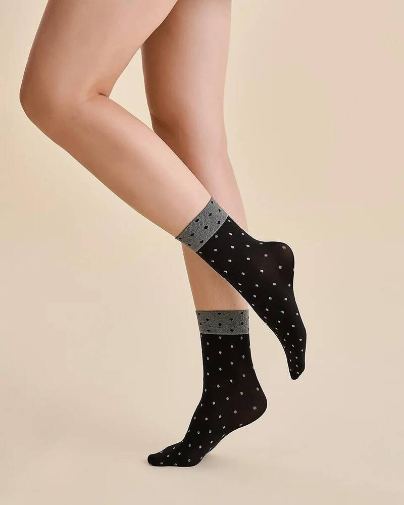 Skarpetki damskie o grubości 50 den ozdobione delikatnym wzorem w kropeczki. Posiadają wygodny, nieuciskający ściągacz.