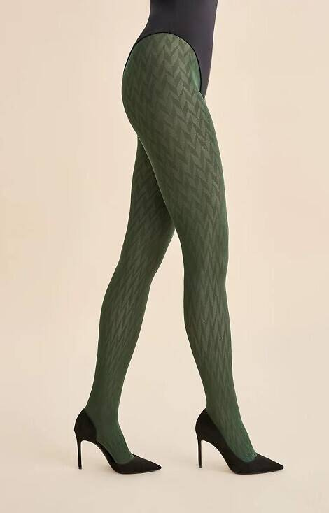 Rajstopy damskie o grubości 60 den z wyrazistym wzorem w jodełkę. Optycznie wysmuklają nogi.
