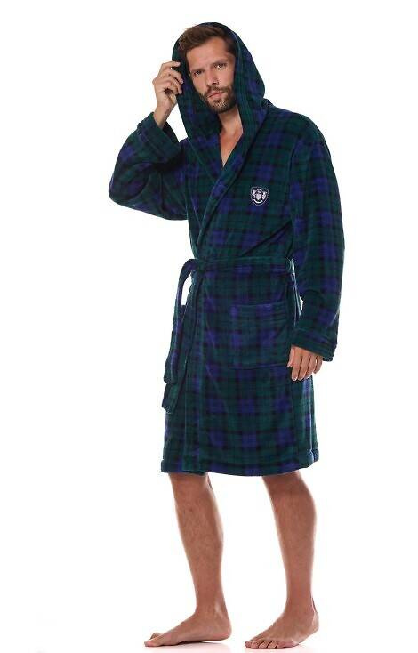 Klasyczny szlafrok męski z kapturem. Uszyty z miłej, miękkiej dzianiny w kratkę. Na wysokości klatki piersiowej ozdobny haft, wiązany w pasie, na biodrach wygodne kieszenie.