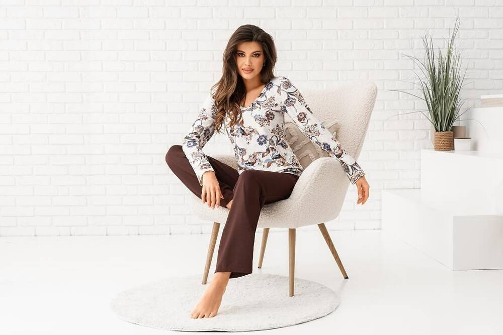 Piżama damska wykonana z delikatnej wiskozy. Koszulka z długim rękawem i dekoltem w kształcie litery "V".