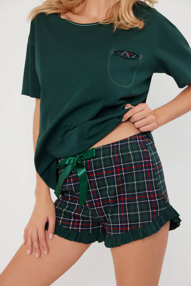 Ta piżama damska to esencja stylu. Bluzka od piżamy posiada pudełkowy fason, który ładnie układa się na sylwetce i jest utrzymana w jednolitym kolorze. Na wysokości piersi posiada kieszonkę, urozmaiconą detalem w kratę oraz białą nitką – podobnie jak okrągły dekolt. Całość zestawiona została z krótkimi spodenkami, również w kratę. Wykończone są one dekoracyjną falbanką oraz dużą, atłasową kokardką. Wykonana ze 100% bawełny.