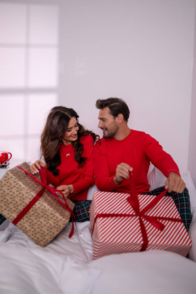 Świąteczna piżama damska to rozwiązanie dla miłośniczek bożonarodzeniowych motywów. Posiada prosty, wygodny fason, zapewniający komfort podczas snu. Górna część to jednolita bluzka z długimi, raglanowymi rękawami, obszytymi kontrastową nicią. Zwieńczona została niewielkim, okrągłym dekoltem z lamówką. Pod nią znajduje się dekoracyjna kokardka. Dolną część kompletu stanowią długie spodnie urozmaicone ponadczasowym nadrukiem w kratę. Zestaw został wykonany z miękkiej i miłej w dotyku 100% bawełny.