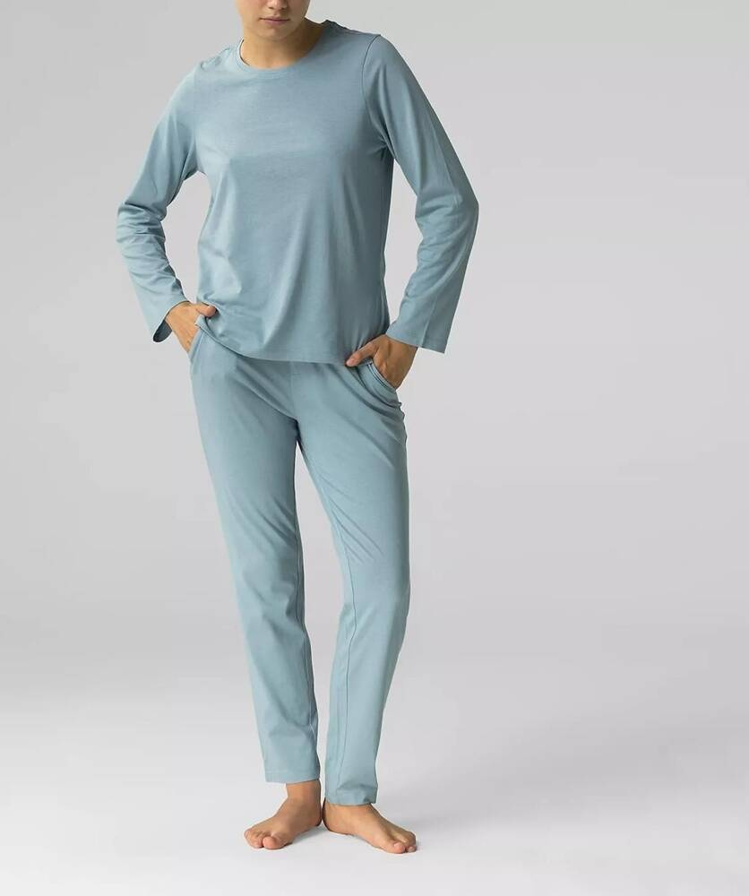 Piżama damska wykonana z miękkiej, przyjemnej w dotyku bawełny Koszulka z długim rękawem, dekolt okrągły . W komplecie długie spodnie z wygodnymi kieszeniami . W pasie nieuciskający ściągacz
