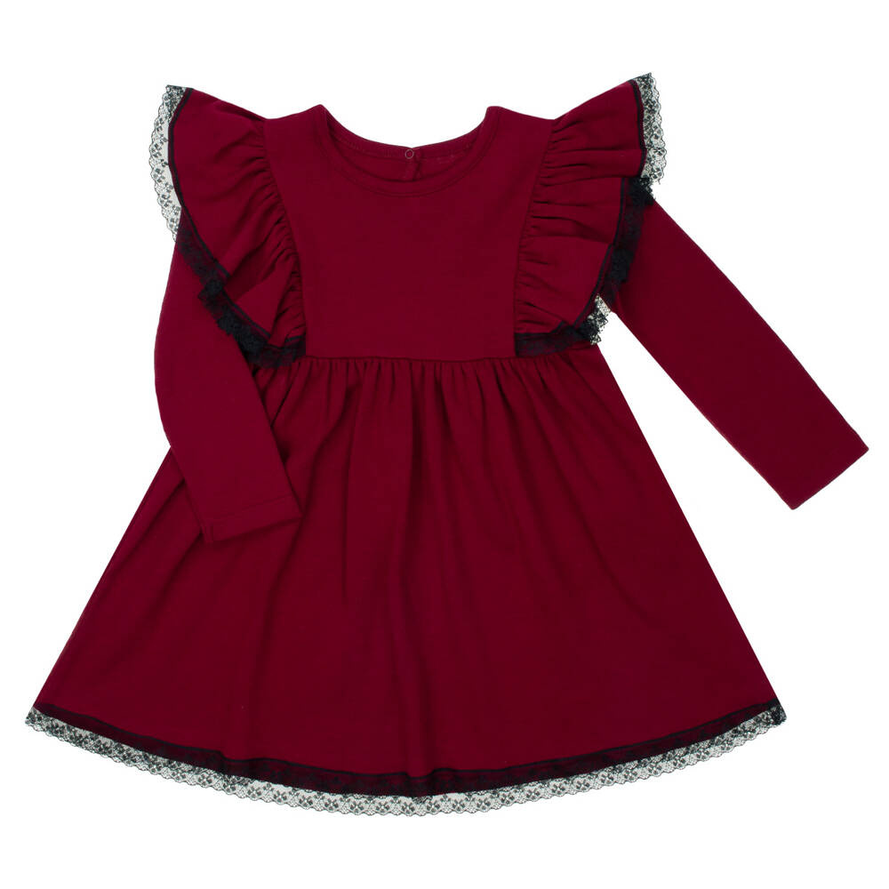 Zapytaj o produktBawełniana sukienka dla dziewczynki w kolorze bordowym. Sukienka na długi rękaw, który jest ozdobiony motylkami. Zapinana na plecach na bezniklowego napa w tzw. łezkę. Produkt posiada certyfikat Oeko-Tex Standard 100 Tekstylia godne zaufania.
