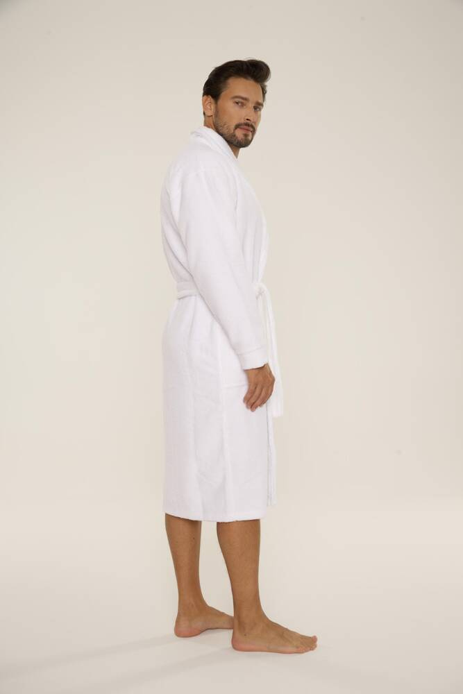 Długi welurowy szlafrok męski. Model z szalowym kołnierzem, wiązany w pasie, z dwoma naszytymi kieszeniami po bokach i jedną na wysokości klatki piersiowej. Wykonany z 50% miękkiej bawełny typu frotte. Materiał przyjemny w dotyku, idealnie wchłaniającej wodę.