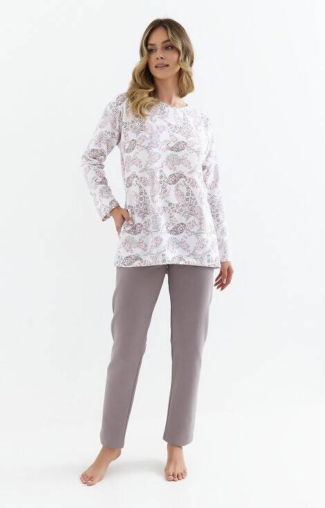 Piżama damska z wysokiej jakości bawełny drapanej. Wyjątkowo ciepła i miła dla skóry. Dłuższa koszulka o luźnym kroju z orientalnym printem. Dekolt okrągły.