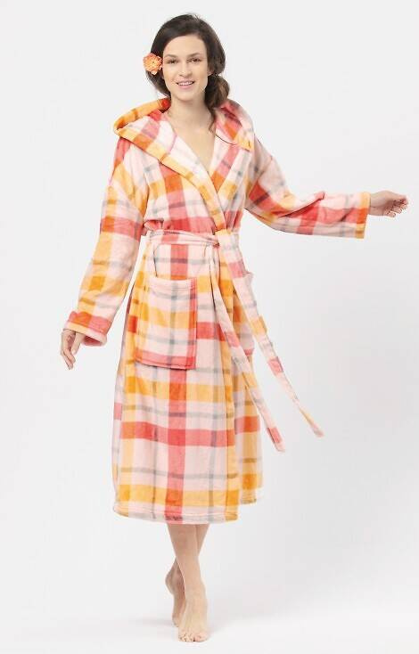 Długi szlafrok damski wykonany z miękkiej dzianiny typu soft ozdobione wzorem w kratkę.