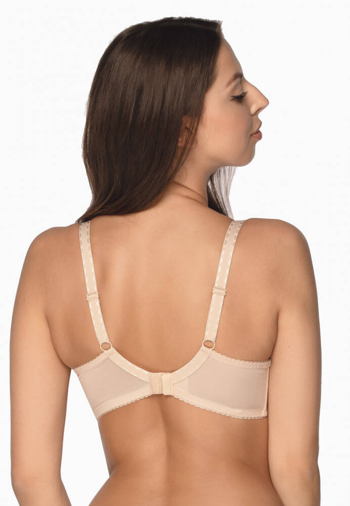 Miseczki wykonane z delikatnej ażurowej koronki o motywie kwiatowym, dolna część miseczki jest usztywniona cieniutką pianką i od środka wyścielona jest 100% bawełną. Półotwarta linia dekoltu i podwyższony krój, zapobiegają wypadaniu piersi podczas ruchu. Plecy składają się z dwóch elementów, z których jeden jest uszyty ze stabilnej, a drugi wykonano ze sprężystej dzianiny.