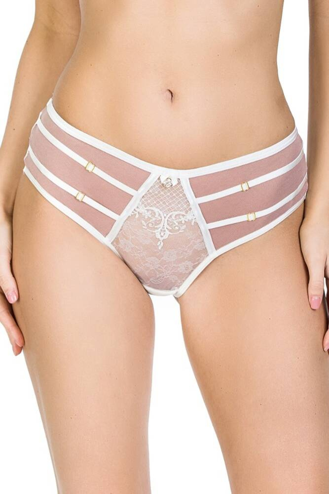 Figi klasyczne wykonane z siatki i tiulu. Środek z plenu zakończonego haftem, boki z beżowej siatki, Tył z beżowej siatki, dół z podwójnego kremowego tiulu, bawełniany klin.