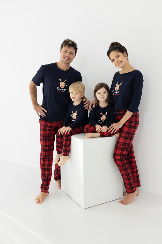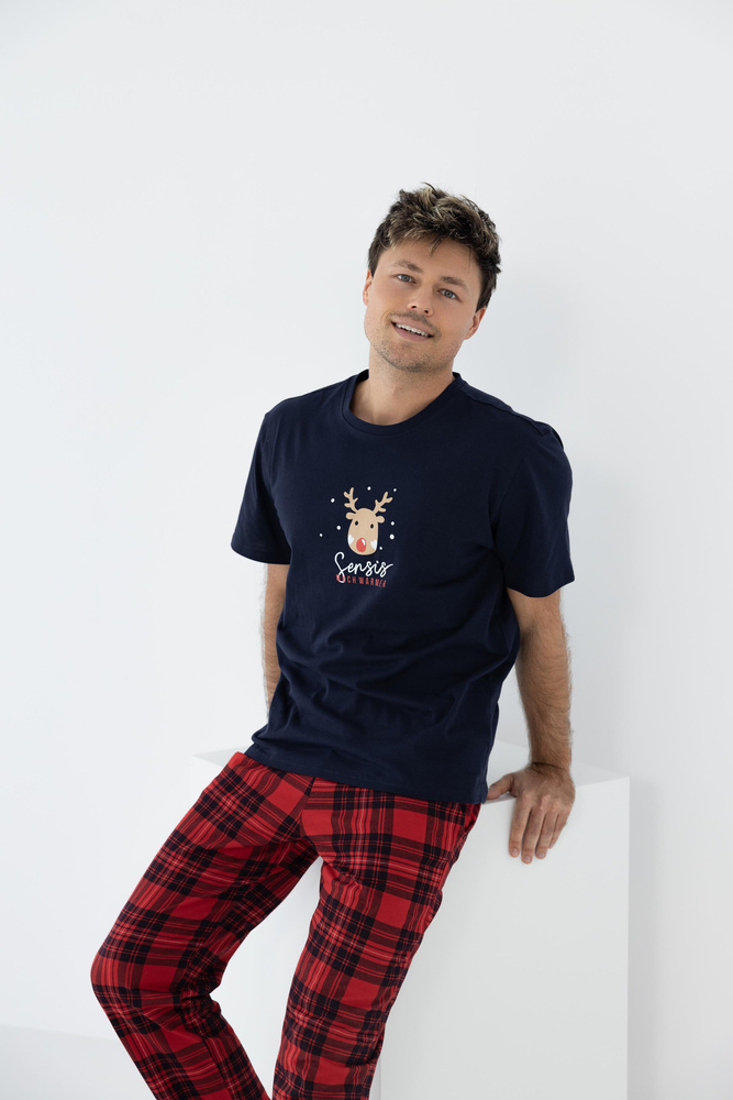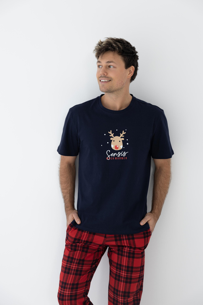 Wygodna i komfortowa piżama męska wykonana z wysokiej jakości bawełny. Koszulka z krótkim rękawem, ozdobiona świątecznym motywem. Do kompletu długie, wzorzyste spodnie z wygodnymi kieszeniami.