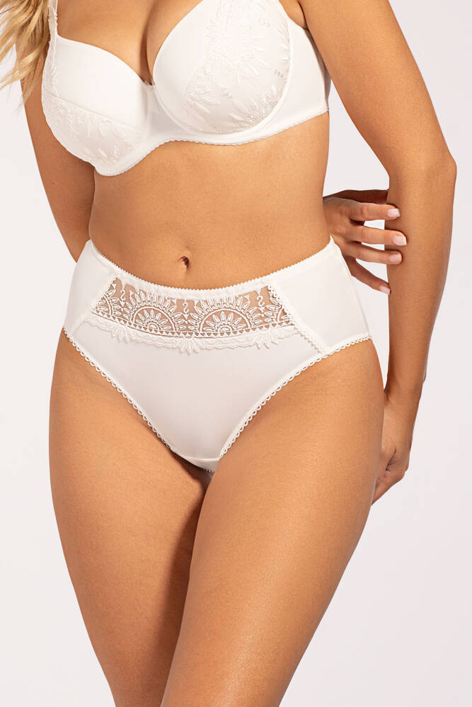 Biustonosz o klasycznym kroju. Doskonale podkreśla średnie i duże biusty. Formuje piersi w pożądany, okrągły kształt. Ramiączka są nieodpinane, z możliwością regulacji na całej długości, szerokością dopasowane do wielkości miseczek. Zapięcia trzystopniowe na dwa lub trzy rzędy haftek.