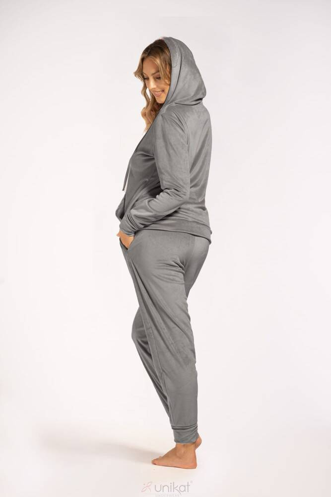 Komplet, która składa się z bluzy i spodni. Idealny zarówno do domowego leniuchowania i na wyjście na miasto. Bluza jest luźna i dzięki temu bardzo wygodna. Spodnie mają luźny krój a przy tym wpisują się w najmodniejsze trendy. Materiał jest gładki i wytrzymały. Aby komplet na długo zachował swój świetny stan, należy go prać według zaleceń na metce.