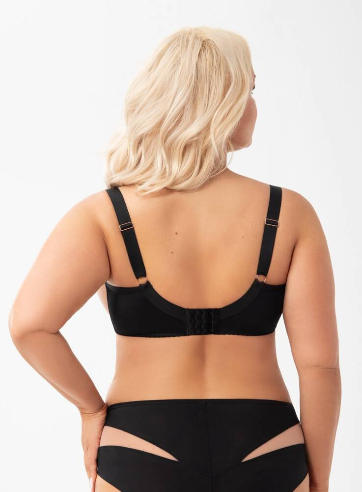 Biustonosz miękki przeznaczony dla kobiet ze średnim i dużym biustem. Zapewnia efekt uniesienia i zebrania biustu do środka. 3-częściowe miski wykonane z haftu podszytego tiulem stabilnym. Dla zwiększenia komfortu użytkowania górna krawędź pasa obwodu wykończona miękkimi lamówkami. Górna krawędź miski przechodzi płynnie do ramiączka powodując lepsze podtrzymanie biustu. Na baskince element ozdobny w kolorze różowego złota. Tył z kryjącej lycry o wysokiej gramaturze i sprężystości dla zwiększenia komfortu. Fiszbiny boczne zapobiegające zwijaniu się materiału. W zależności od rozmiaru dwu lub trzyrzędowa haftka z trójstopniową regulacją obwodu. Nieodpinane, regulowane ramiączka w trzech szerokościach. Metale w kolorze różowego złota (nie zawierają niklu)