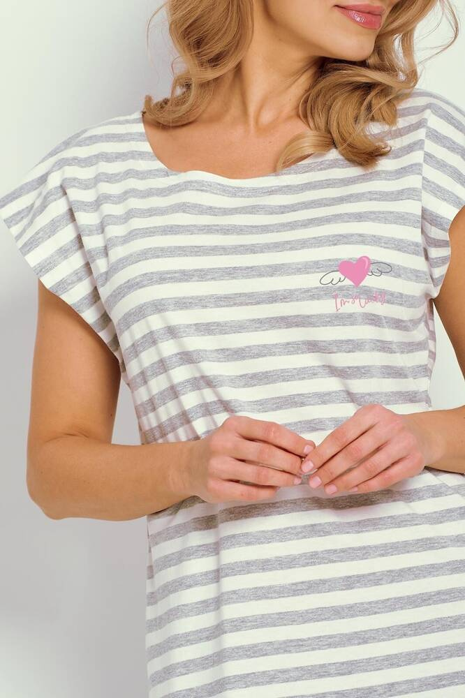 Koszula damska z krótkim rękawem . Całość uszyta z wysokiej jakości bawełny w paski . Półokrągły dekolt. Długość przed kolano
