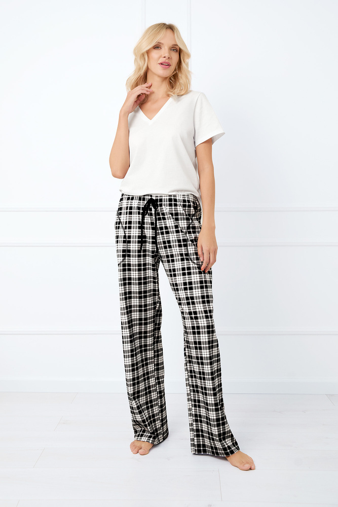 Damskie, długie spodnie od piżamy zaprojektowano z myślą o wygodzie podczas snu i wypoczynku. Posiadają klasyczny, luźny fason. W pasie nieuciskająca gumka z ozdobnym sznurkiem. Całość urozmaicono wzorem w kratę oraz wykonano z miękkiej i przewiewnej bawełny, która świetnie się sprawdza o każdej porze roku.