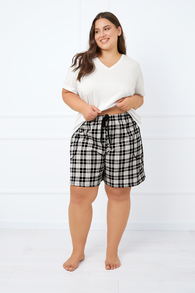 Krótkie spodnie do spania Klara to model, w którym zadbano o każdy szczegół. Posiadają prosty fason z luźnymi nogawkami oraz obszernymi, naszytymi kieszeniami. Uwagę przyciąga ponadczasowy, klasyczny wzór w kratkę. W pasie znajduje się nieuciskająca gumka z ozdobnym sznurkiem.