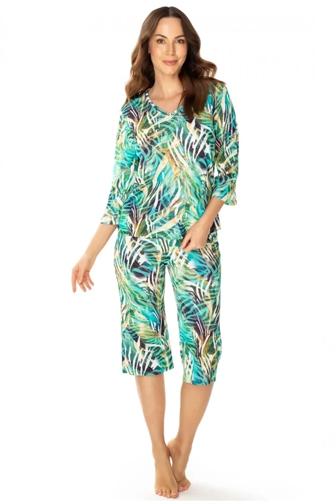 Komplet w energetyzujących barwach składający się ze spodni o długości 3/4 oraz bluzki z rękawem o tej samej długości i dekoltem V-neck. Piżama o bardzo oryginalnym wzorze, kojarzącym się z tropikalną świeżością i orzeźwiającą bryzą. Wzór nawiązuje do elementów przyrody, botanicznych i zwierzęcych akcentów, co czyni ją wyjątkową i pełną charakteru.Wykonana z jedwabiu wiskozowego, Malaga to piżama, która jest delikatna, zmysłowa i miła w dotyku. Materiał ten ma unikatowe właściwości, które przyciągają kobiety szukające produktów najwyższej jakości. Jest antyalergiczny, antybakteryjny, nie elektryzuje się i skutecznie transportuje wilgoć na zewnętrzną warstwę materiału.