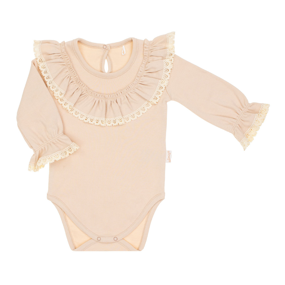 Body z długim rękawem dla dziewczynki, uszyte ze 100% bawełny. Materiał posiada certyfikat Oeko-Tex Standard 100 Tekstylia godne zaufania. Produkt zapinany na plecach i w kroku na bezniklowe napy, zapewniając komfort przy ubieraniu.