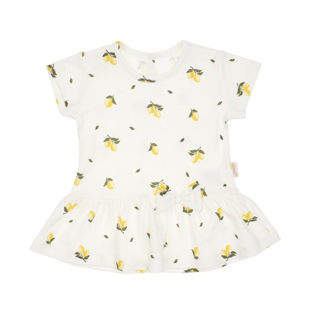 Zapytaj o produktBluzka z krótkim rękawem dla dziewczynki. Idealna na wiosnę i lato. Nadruk wykonano bezpieczną metodą farb wodnych. Model zdobi falbanka na dole oraz kokardka na przodzie .Na plecach zastosowano zapięcie typu łezka, na bezniklowego napa.
