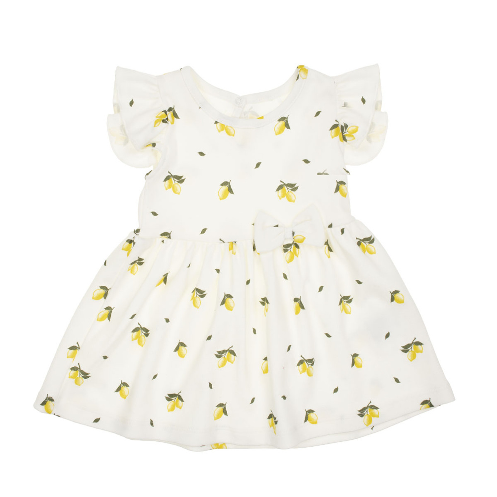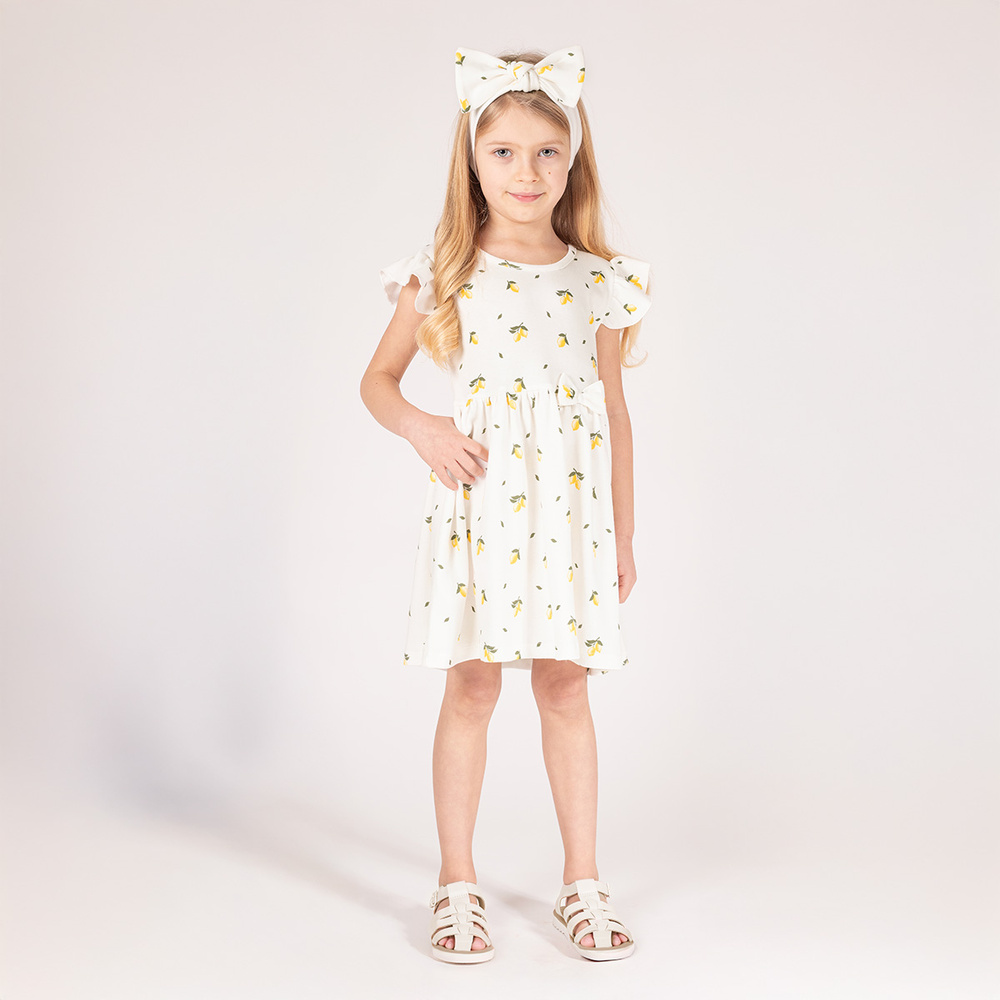 Zapytaj o produktModna sukienka z krótkim rękawkiem dla dziewczynki. Wykonana z przewiewnej 100 % białej bawełny w wzór cytrynek. Zapięcie łezka na plecach. Materiał jest całkowicie bezpieczny dla skóry dziecka. Fason zdobią marszczone rękawki zakończone falbanką, Dolna część sukienki została zmarszczona na linii talii oraz dół sukienki zdobi falbanka. Sukienka jest wygodna i przewiewna. Produkt idealnie sprawdzi się na gorące lato.