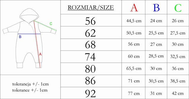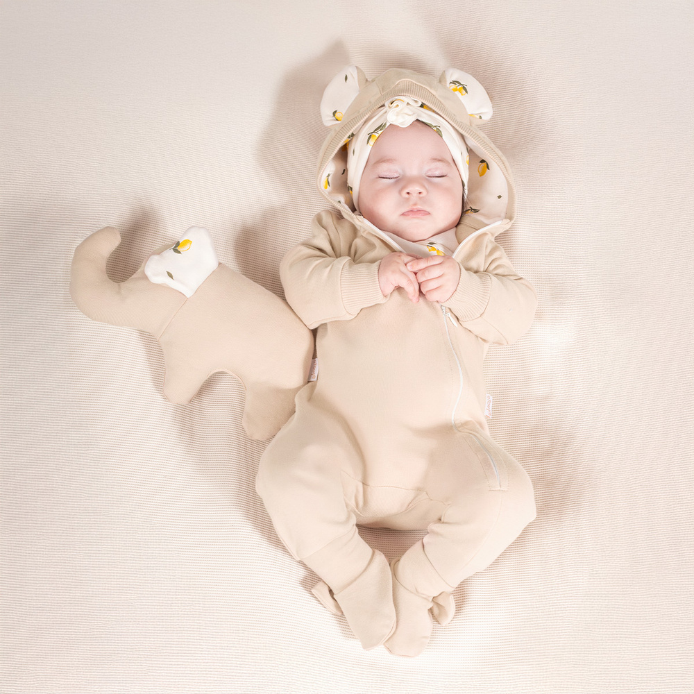 Pajac dresowy, uszyty z beżowej bawełny dresowej z niewielką ilością elastanu. Idealny do wózka, czy fotelika. Posiada ściągacze w rękawach, przy nogawkach oraz kaptur z uszkami. Dzięki wykonaniu z certyfikowanej bawełny dziecko będzie w nim się czuło wygodnie. Pajacyk zapinany na wygodny zamek-ułatwi to ubieranie maluszka.