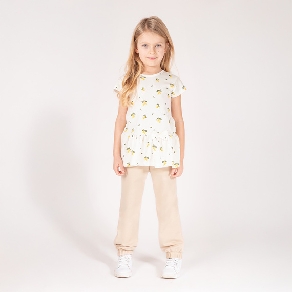 Wygodne spodnie dla dziewczynki, uszyte z bawełny dresowej w kolorze beżowym. Nogawki zakończone zostały ściągaczem. W pasie szeroka, nie uciskająca brzuszka gumka.