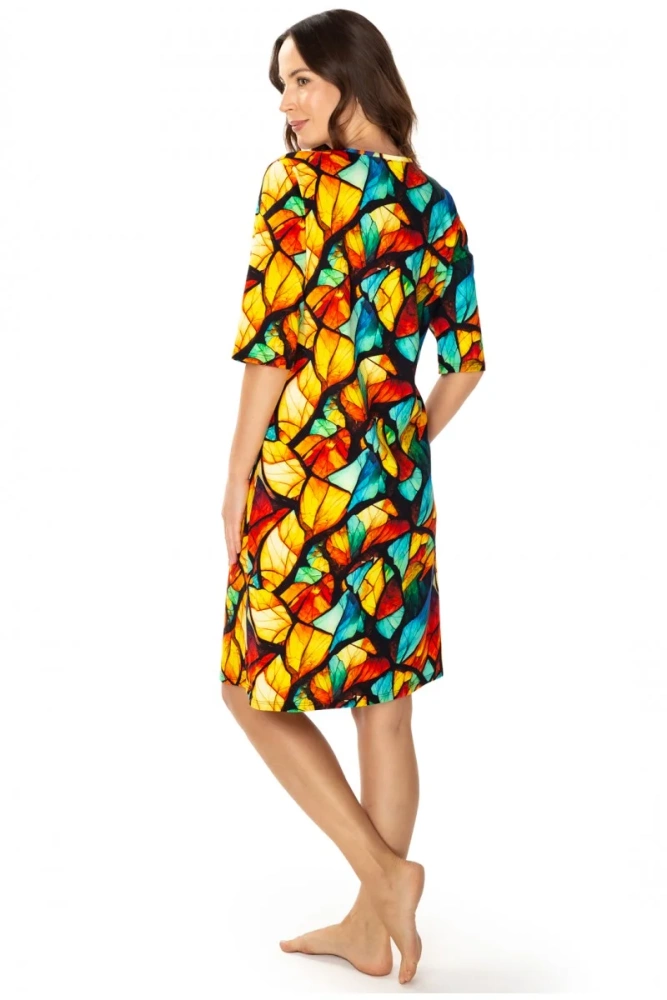 Witrażowy wzór koszuli sprawia, że wyróżnia się na tle klasycznych modeli, a rękaw 3/4 zapewnia idealne dopasowanie na każdą porę roku. Koszula wykonana jest z wysokiej jakości bawełny, który gwarantuje komfort i wygodę podczas snu. Doskonale sprawdzi się jako element nocnej garderoby dla kobiet ceniących nie tylko komfort, ale i unikalny design. Bawełna delikatnie otula ciało, pozwalając na pełen relaks. Krój zapewnia swobodę ruchów, a dekolt w kształcie litery V dodaje subtelnej elegancji.
