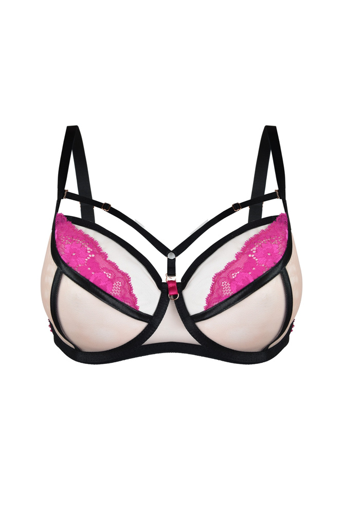 Miseczki w dolnej części wykonane z podwójnego tiulu. Miseczki wykonane z beżowej siatki, różowa koronka umieszczona w górnej części miseczek dodaje uroku. Dekolt zdobią paseczki z regulacją.