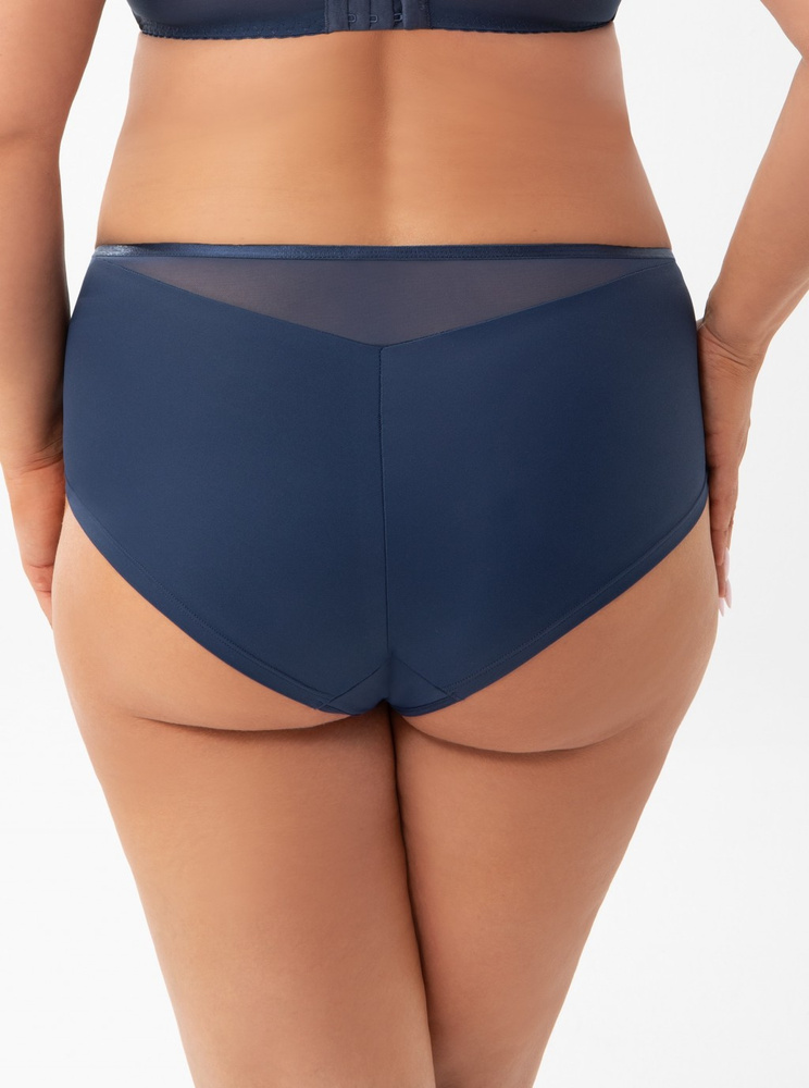 Figi wykonane z kryjącej microfibry ze wstawkami z haftu. Zabudowany fason zasłaniający prawie całe pośladki. Tył wykończony poprzez podwinięcie krawędzi microfibry na płasko. Bawełniany kroczek. Metalowe elementy w kolorze jasnego złota